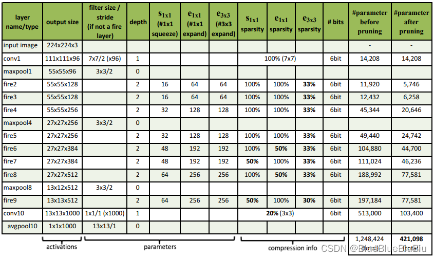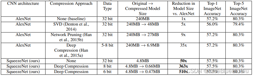 需要注意的是,对于已经设计好的小参数量模型是否还能够继续进行压缩,作者在本篇文章中做了相关实验。作者采用Deep Compression对SqueezeNet进行压缩,首先使用33%的稀疏和8-bit的量化,使参数量减少了AlexNet的363倍,但是模型性能与AlexNet相等;其次,使用33%的稀疏和6-bit的量化,使参数量减少了AlexNet的510倍,但是模型性能与AlexNet相等。实验证明,小模型依旧可以压缩。压缩后的SqueezeNet与SqueezeNet相比,精度一样,参数量减少10倍。