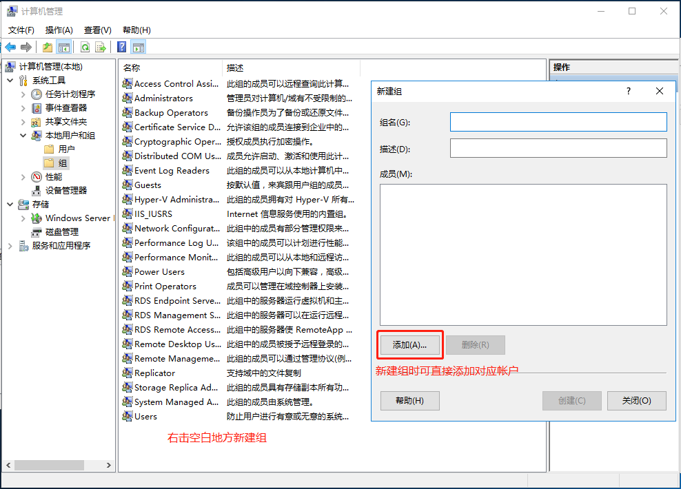 在本地用户和组界面选择组,直接右键单击空白地方,然后新建组