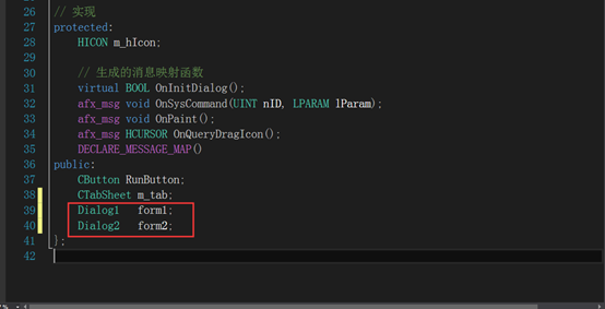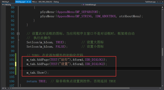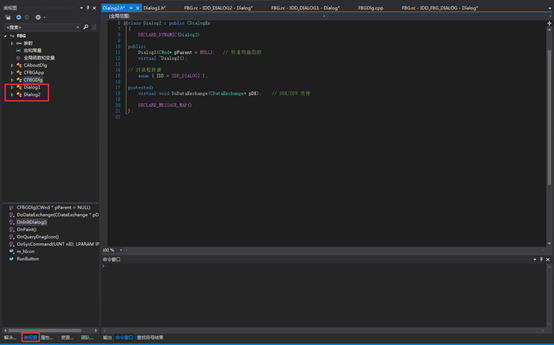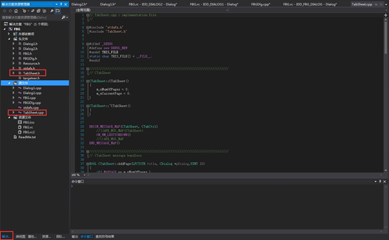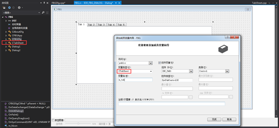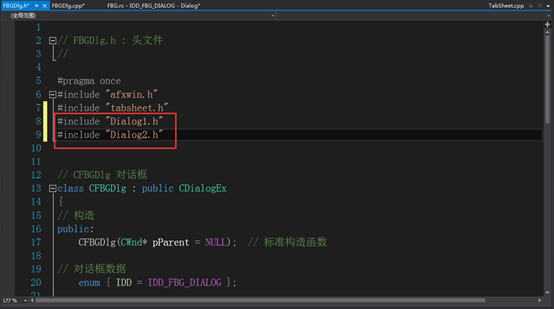 7.使用m_tab变量来关联Dialog1和Dialog2,关联之前需要在主文件对应的头文件中(我用FBG来创建的项目,这里就是FBGDlog.h)引入Dialog1和Dialog2头文件,然后用CDialog1和CDialog2类来定义变量。
