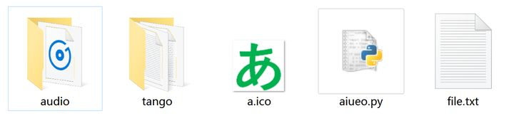 aiueo.py为代码,audio文件夹、tango文件夹和file.txt为程序关联调用的文件,a.ico为软件图标。