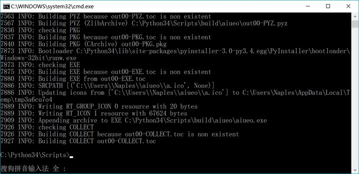 ③输入:pyinstaller.exe -i C:\Users\Naples\aiueo\a.ico -w C:\Users\Naples\aiueo\aiueo.py 回车。