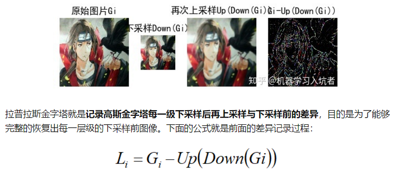 拉普拉斯金子塔可以理解残差金子塔,它是用来存储下采样后的图像于原始图像的差异的。假如原始图像为 G0,金字塔中任意一层图像为 Gi,下采样后得到 Gi+1 = Down(Gi), 由于图像下采样之后尺寸发生了变化,若将下采样后的图进行上采用得到 Up(Down(Gi)), 但是下采样后的变化是不可逆的即不可能恢复成原始图像。因此,有部分信息丢失不能完全恢复成原始图像。拉普拉斯金字塔就是记录金字塔每一层下采样后再上采用回来与该层之间的差异的。
