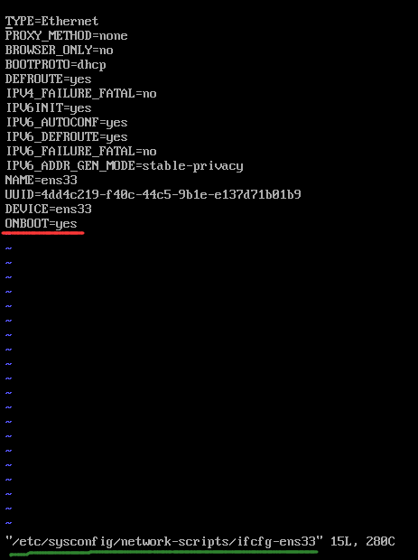 红色标注即为我们要修改的地方,把它由原来的ONBOOT=no改为yes即可,设置为自动开启