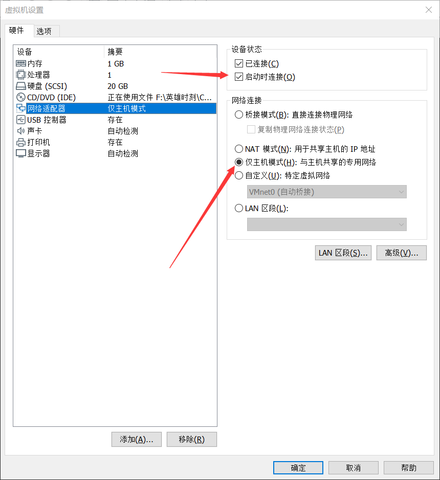 选择仅主机方式,这样只有我们的window主机才能与linux相互访问,主机就相当于我们的网关。