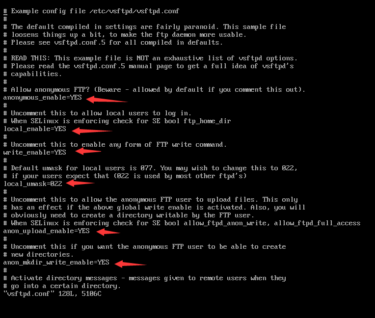 vsftpd.conf是这里边最重要的配置文件,我们要做的修改是: