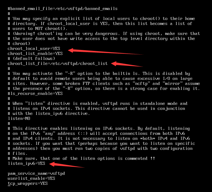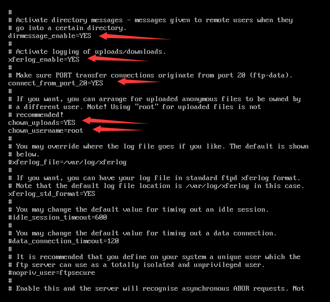 要注意的是第二张图中的chown_username=whoever要改成=root,root就是匿名上传文件时的默认所属用户名,设置完这个选项,我们匿名登录ftp,并上传文件的时候,Linux就默认是root角色发起的上传请求,也正是因此,我们要把ftpusers中的root去掉,也就是从黑名单中去掉,这样我们就可以匿名上传文件了。