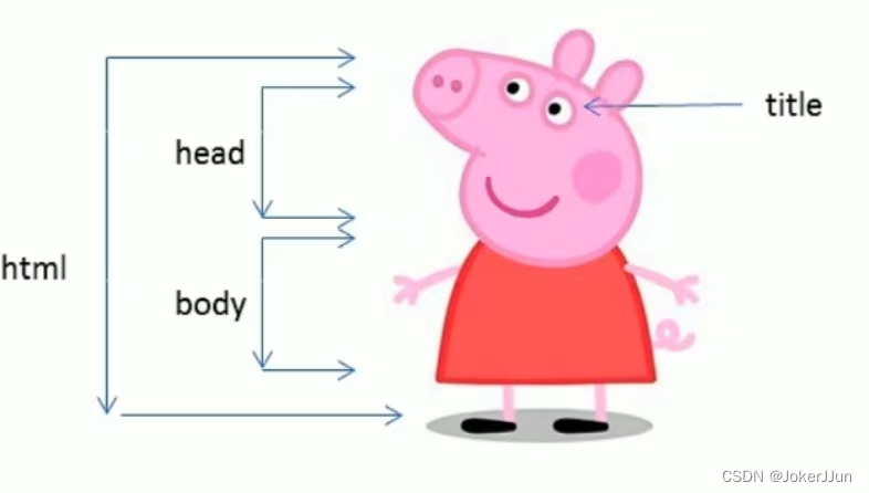 html可以看成小猪佩奇,head看成是小猪佩奇的头部,title可以看成是小猪佩奇的眼睛,因为眼睛属于头的一部分,所以head和title属于包含关系,body可以看成是小猪佩奇的身体,,因为head和body构成了html,所以可以head和body属于并列关系。
