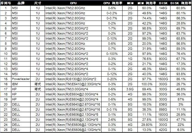 公司IT机房目前共有35台服务器,除去因故障、无硬盘、没有使用,目前正在使用的服务器为25台。本信息表仅统计正在使用的服务器资源进行统计。