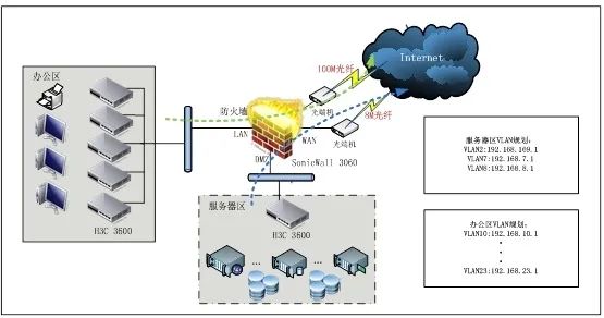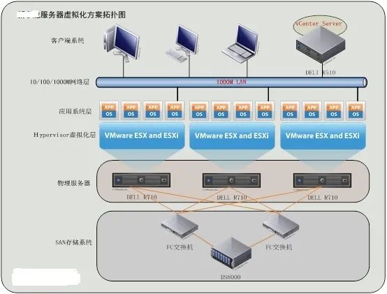 整个方案采用分层虚拟架构体系,依次分为SAN存储系统层,物理服务器层,虚拟化管理层,应用系统层,1000M网络层,客户端与监控管理层。