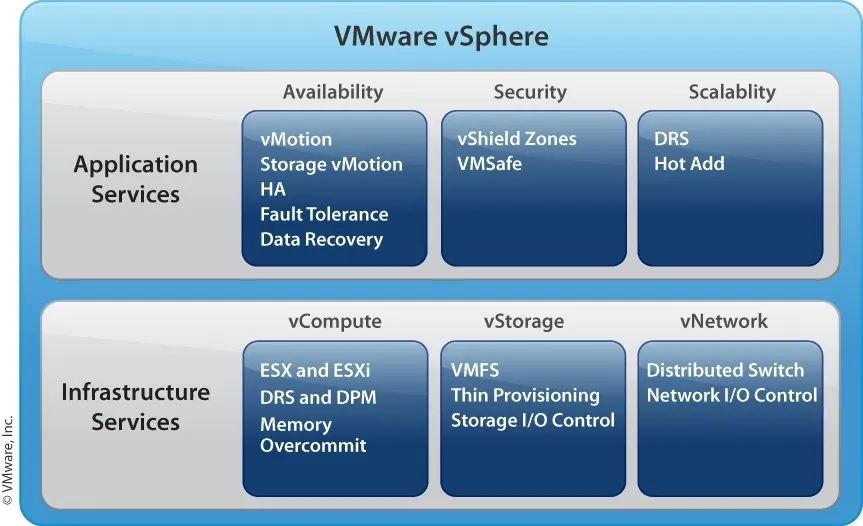 VMware虚拟化平台做为统一的服务平台,包括二个层次:基础架构服务层和应用程序服务层。