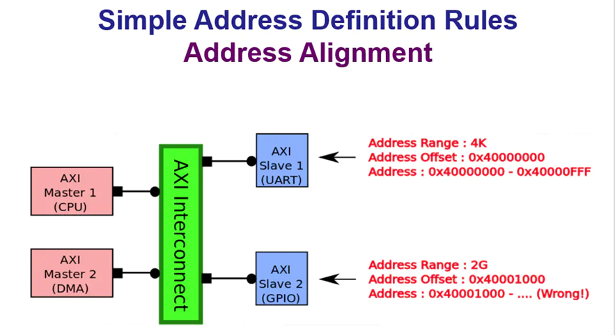 如上图所示,给Slave1分配好地址之后,直接接在Slave1的地址之后给Slave2分配地址是不行的,因为Slave2的地址范围(Address Range)过大,从0x40001000分配最多只能分配到0x40001FFF,即最多分配4K,而现在需要分配2G,应将地址偏移(Address Offset)设为2G的边界(boundary),即地址偏移+地址范围=FFFFFFFF,故此时地址偏移应该为0x80000000。