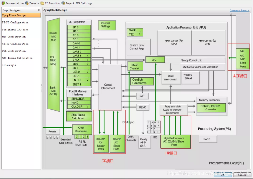 我们可以双击查看ZYNQ的IP核的内部配置,就能发现上述的三种接口,图中已用红色方框标记出来,我们可以清楚的看出接口连接与总线的走向: