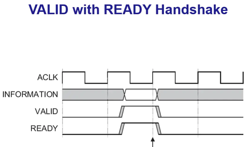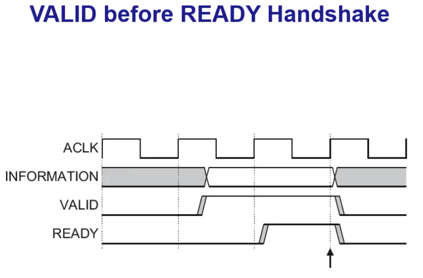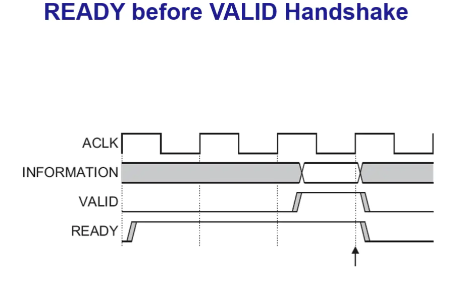 上图中的模式为READY信号伴随着VALID信号拉高,此时数据在VALID信号和READY信号为高时,在时钟上升沿触发。在这种情况下,信息传输立马发生,如图箭头处指明信息传输发生。