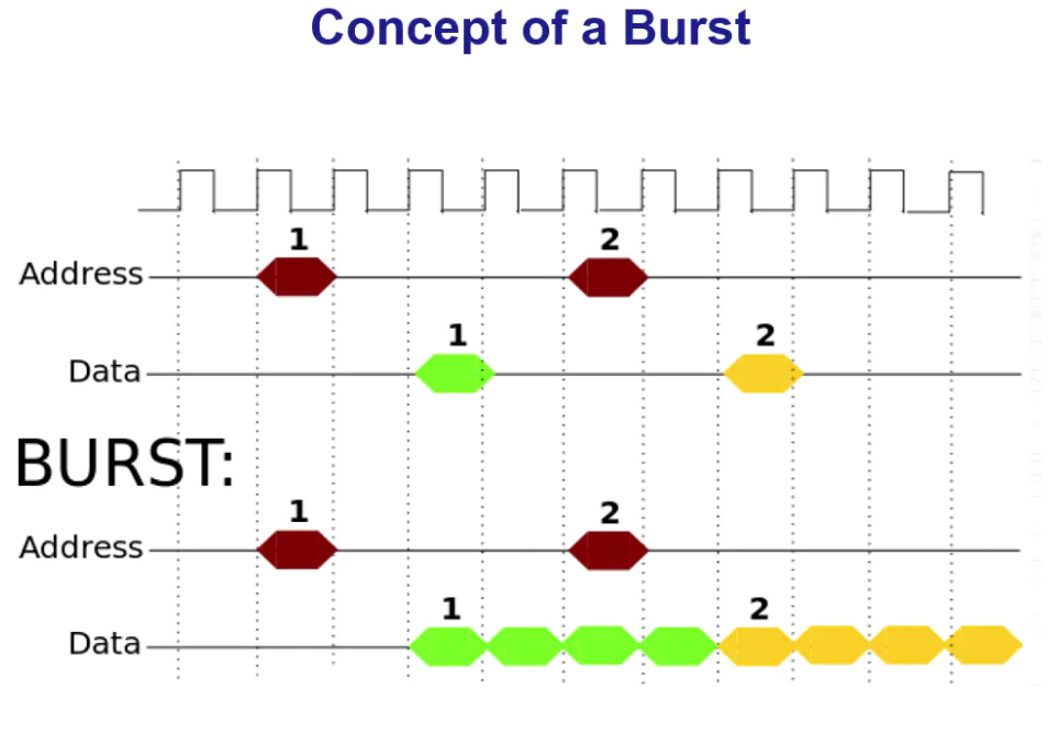 按照传统的RAM的读写方式,给定一个Address,只能读取或者写入一个Data,但是在Burst模式下,给定一个Address,可以连续写入或者读取多组数据。