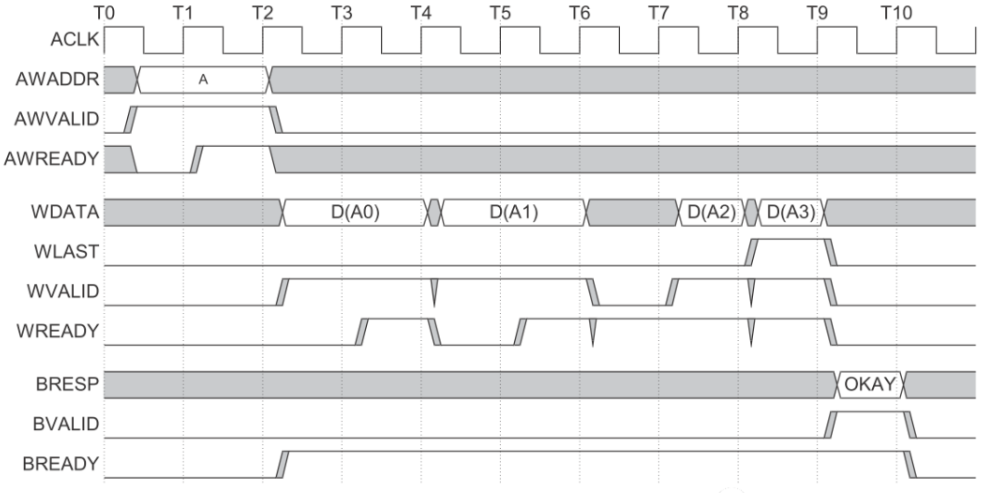这一过程的开始时,主机发送地址和控制信息到写地址通道中,然后主机发送每一个写数据到写数据通道中。当主机发送最后一个数据时, WLAST 信号就变为高。当设备接收完所有数据之后他将一个写响应发送回主机来表明写事务完成。