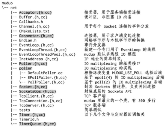 muduo 是基于Reactor模式的网络库,核心是事件循环EventLoop,用于响应计时器和IO事件,muduo采用基于对象的设计风格,事件的回调接口多以boost::function+boost::bind表达。muduo源码的目录结构为: