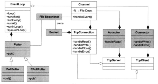 muduo网络库的核心位于muduo/net和muduo/net/poller,其中灰底表示用户不可见的内部类:
