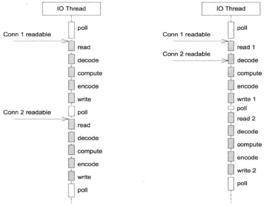 计算和IO在同一个线程,没有事件的时候,线程等待在select/poll/epoll等函数上,事件到达后由网络库处理IO,再把消息通知客户端代码,网络库负责读写Socket,用户代码负责解码、计算、编码。事件顺序处理,无法保证优先级。这种模式适用于IO密集的应用,不太适合CPU密集的应用;