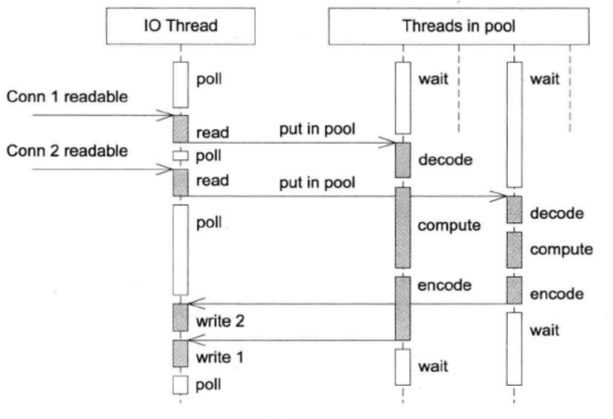 主线程负责IO,工作线程负责计算,使用固定大小的线程池,全部的IO工作都在一个Reactor线程完成,而计算任务交给线程池,这种模式适用于计算任务彼此独立,而且IO压力不大的场景,有乱序返回的可能,客户端要根据id来匹配响应。