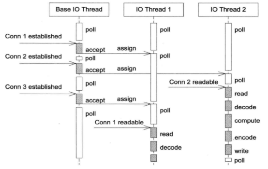 既有多个Reactor来处理IO,也使用线程池来处理计算,这种模式适合既有突发IO,又有突发计算的应用。