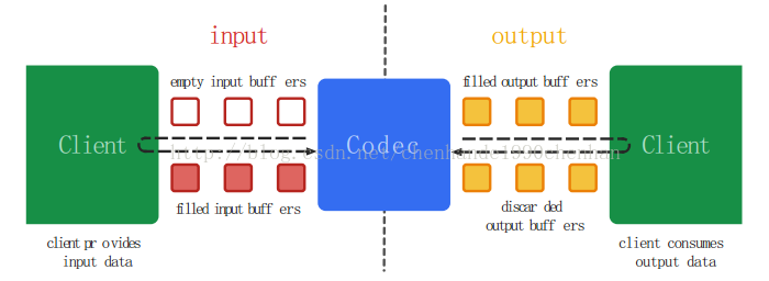 MediaCodec采用异步方式处理数据,并且使用了一组输入输出缓存(ByteBuffer)。通过请求一个空的输入缓存(ByteBuffer),向其中填充满数据并将它传递给编解码器处理。编解码器处理完这些数据并将处理结果输出至一个空的输出缓存(ByteBuffer)中。使用完输出缓存的数据之后,将其释放回编解码器。