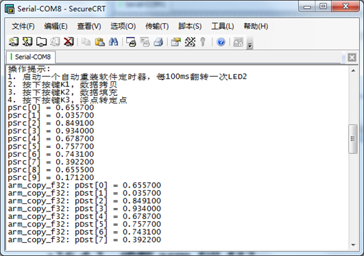 - 按下按键K1, 串口打印函数DSP_Copy的输出结果。