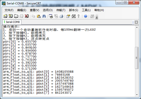 - 按下按键K3, 串口打印函数DSP_FloatToFix的输出结果。