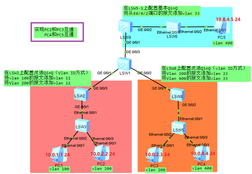 在LSW3、LSW5、LSW6上配置相关Vlan接口(access口和trunk口),并根据需要放行相关的内层Vlan(100、200、400)