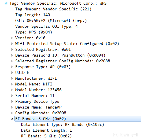 3. OUI取值为0x00-50-F2-04。其中00-50-F2代表Mircrosoft公司的OUI,04代表WPS;