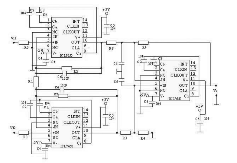 ICL7650斩波稳定运算放大器芯片是ntersi的第4代运算放大器,性能优越且稳定,被广泛用作精密仪器,用于弱信号检测和过程控制系统中的前置放大器,ICL7650具有以下特性:极低的输入失调电压,在整个工作温度范围内,低输入偏置电流,温度漂移和长期失调电压漂移低,转换速率高,内部有钳位电路,可以减少过载时的恢复时间,并且在入口和出口端有很小的截止峰值泄漏。结合仪表放大器原理,实际电路设计是输入电流狠制保护电阻。ICL7650的电路是用来滤涂电源电压引起的干扰,采样电容器动态零位校准中起着关键作用,直接影响运算放大器自动零位稳定的精度。因此,从聚乙烯材料中选择高质量的电容器,组成滤波器网络,以滤除ICL7650模拟开关的切换引起的尖峰噪声,并减少输出电压的过冲。电路的第一级是两个ICL7650对称集成运算放大器,具有高输入阻抗和共模抑制比,并将双端输入更改为单端输出。由于失调电压和整个电路的漂移相关,可以选择具有超低失调电压和超低漂移的ICL7650集成运算放大器,作为高精度的放大器,ICL7650的翰入通常只有几百微伏甚至几十微伏时才能正常工作,创建仿真电路原理图,设置功能信号发生器,以仿真传感器发送的微弱信号,将输入信号频率设置为20Hz,幅度设置为10uV,输出信号的波形10uV交流信号由放大器电路放大,可以获得30mV交流信号的电压,电路幅度-频率特性测试,设计的放大器电路主要用于放大弱的低频信号,并且还具有高频抑制功能,设置合理的参数,并显示电路的福频特性曲线,调整参数后,可以使电路失真为零,电路具有较高的建模质量。