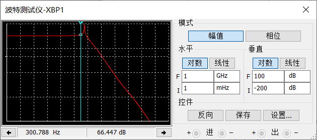 电路幅频特性测试:本文设计的放大电路主要是放大低频微弱信号, 对高频也有一定的抑制, 双击 XBP1 波特图 示仪的图标, 设置合理的参数, 显示出电路的幅频特性曲线, 如图 5 图6所示, 在图中曲线的中间水平 线中可以清楚得到电路的增益为 63.602dB,用鼠标拖动读数轴可得上限频率 fH =300.788Hz, 下限 频率 fL=0, 频带宽度 B= fH - fL =300.788Hz.。