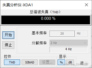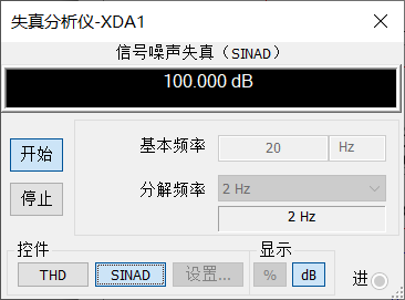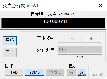 电路失真度测试 :双击 XDA1 的失真度测量仪图标, 出现如图 7 图8 所示界面, 调整好参数, 可得到电路的失真度为零, 信噪比是 100dB, 所以本电路 信噪比高, 噪音小。