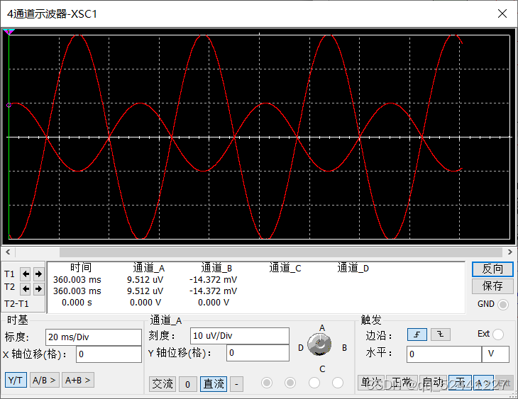 10uV 交流信号经过图 2 放大电路放大, 可得到 30mV 的电压交流信号, 如图4所示。