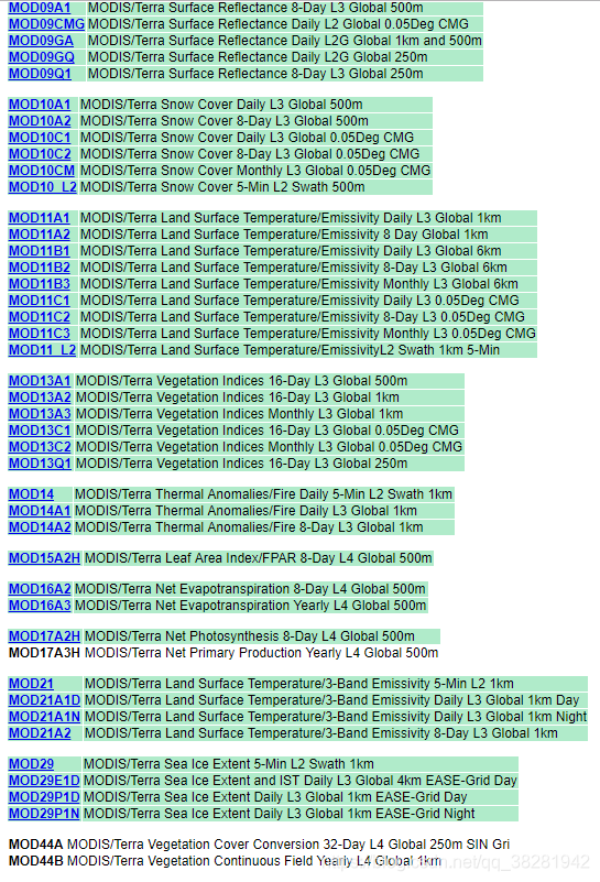 很多时候,用到的都是MODIS的成品数据,为了方便寻找合适的数据产品,下面给出MODIS各级产品的介绍: