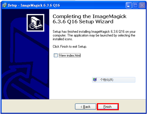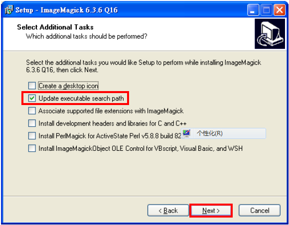 12、安装ImageMagick-6.3.6:直接运行ImageMagick-6.3.6-6-Q16-windows-dll.exe默认点击下一步,直到出现Select Additional Tasks,这时需要勾选“Update executable search path”