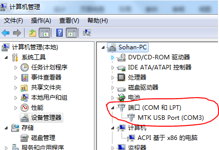 3、计算机管理->设备管理器->端口,找到当前板子跟电脑连接的com口。