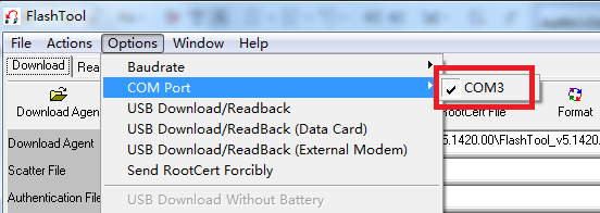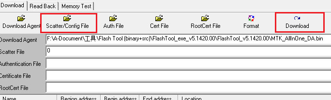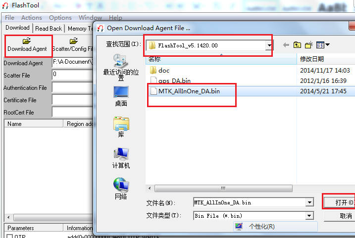 点击DownloadAgent,选择跟Flash_tool.exe同一目录下的MTK_AllInOne_DA.bin。