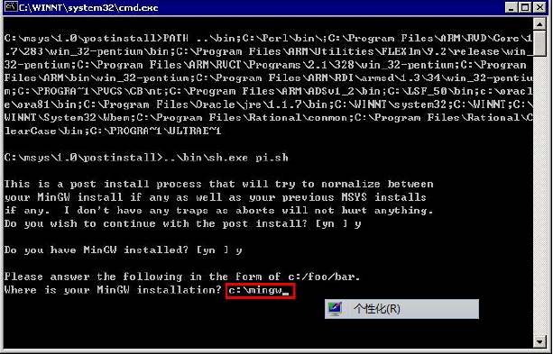 11、安装MSYS:直接运行MSYS-1.0.10.exe,默认点击下一步,出现cmd窗口的时候全部选’y‘,出现如下窗口时,输入MinGw的安装路径,