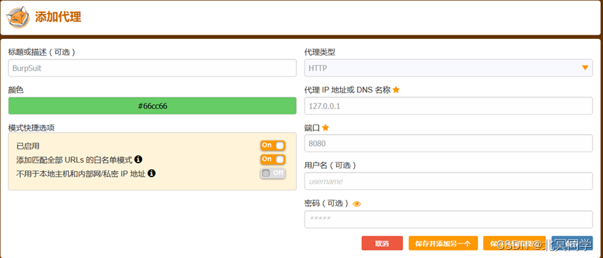 第五步:点击添加,进入添加代理页面。设置代理标题(如使用BurpSuit代理,可在标题或描述中设置为:BP。设置代理类型、IP、端口号,若代理服务器有用户名和密码,则填写用户名和密码;没有则不填。进行保存。