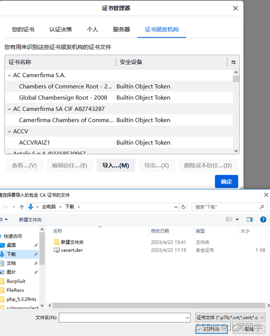 第二步:点击查看证书,既进入证书管理器页面,选择证书颁发机构选项,点击导入,选择下载到本地的证书文件:cacert.der。