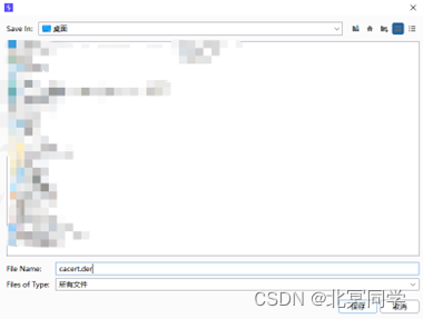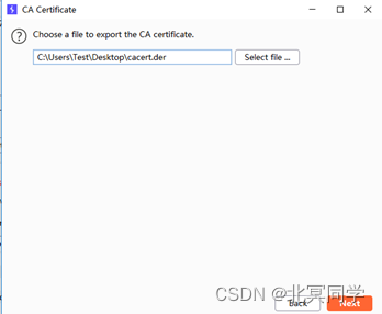 第三步:进入“choose a file to export the CA certificate”,点击select file….,选择存放证书的位置,并且为证书命名(建议:cacert.der),点击保存。再点击 Next.