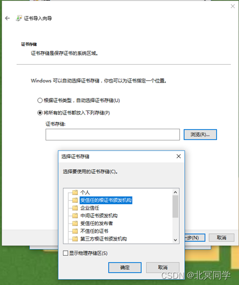 进入证书向导页面,在证书存储模块下点击”将所有的证书都放入下列存储”,点击”浏览”,选择将证书存储在“受信任的根证书颁发机构”—> 点击下一步 —> 完成。