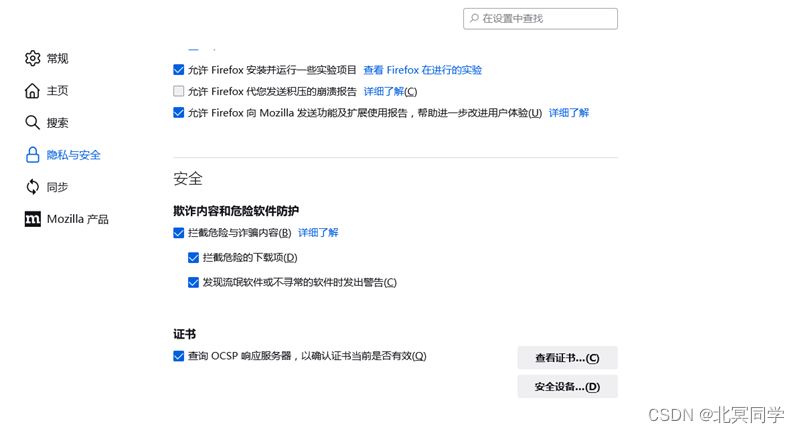 第一步:打开Firefox浏览器—> 点击右上角—>点击设置—>隐式与安全—>找到证书,点击查看证书。