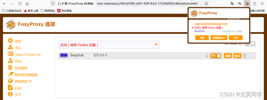 第三步:进行代理服务器/BurpSuit设置。点击浏览器右上角Foxy Proxy图标。