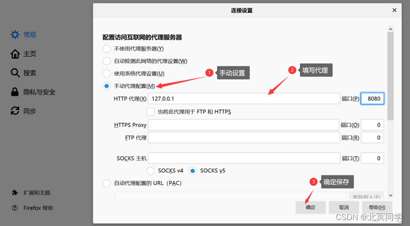 第二步:点击设置之后,进入连接设置页面,选择“手动代理配置”->填写代理ip和端口,点击确认进行保存。