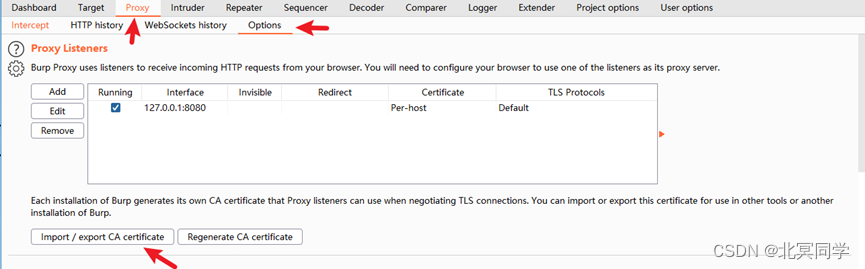 第一步:打开BurpSuit,进入Proxy模块—> Options模块,找到proxy Listener,点击“import/export CA certificate”