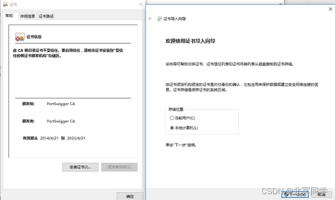 解决这个问题需要下载Burp Suitdede CA证书,同时安装并存储证书。