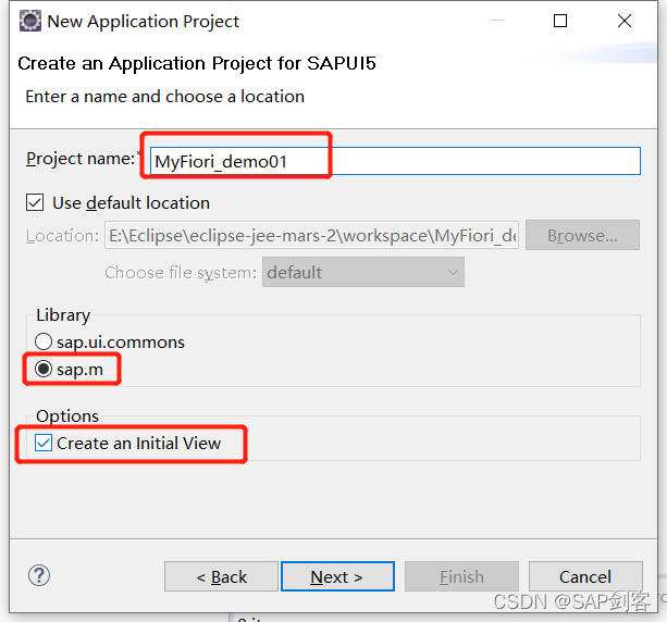 输入项目名称,选择存储位置,选择Library为“sap.m”,它可以支持手机和桌面,在Options中选择创建初始屏幕。