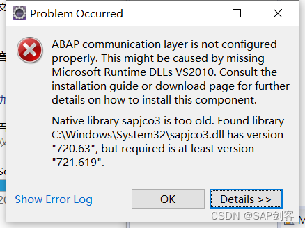 重启Eclipse发生如下错误,原因是现有的sapjco3.dll版本太老了,需要重新下载新的覆盖。