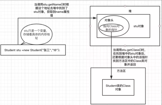 谈到对象的访问,还拿上面学生的例子来说,当我们拿到stu对象时,直接调用stu.getName();时,其实就完成了对对象的访问。但这里要累赘说一下的是,stu虽然通常被认为是一个对象,其实准确来说是不准确的,stu只是一个变量,变量里存储的是指向对象的指针,(如果干过C或者C++的小伙伴应该比较清楚指针这个概念),当我们调用stu.getName()时,虚拟机会根据指针找到堆里面的对象然后拿到实例数据name.需要注意的是,当我们调用stu.getClass()时,虚拟机会首先根据stu指针定位到堆里面的对象,然后根据对象头里面存储的指向Class类元信息的指针再次到方法区拿到Class对象,进行了两次指针寻找。具体讲解图如下: